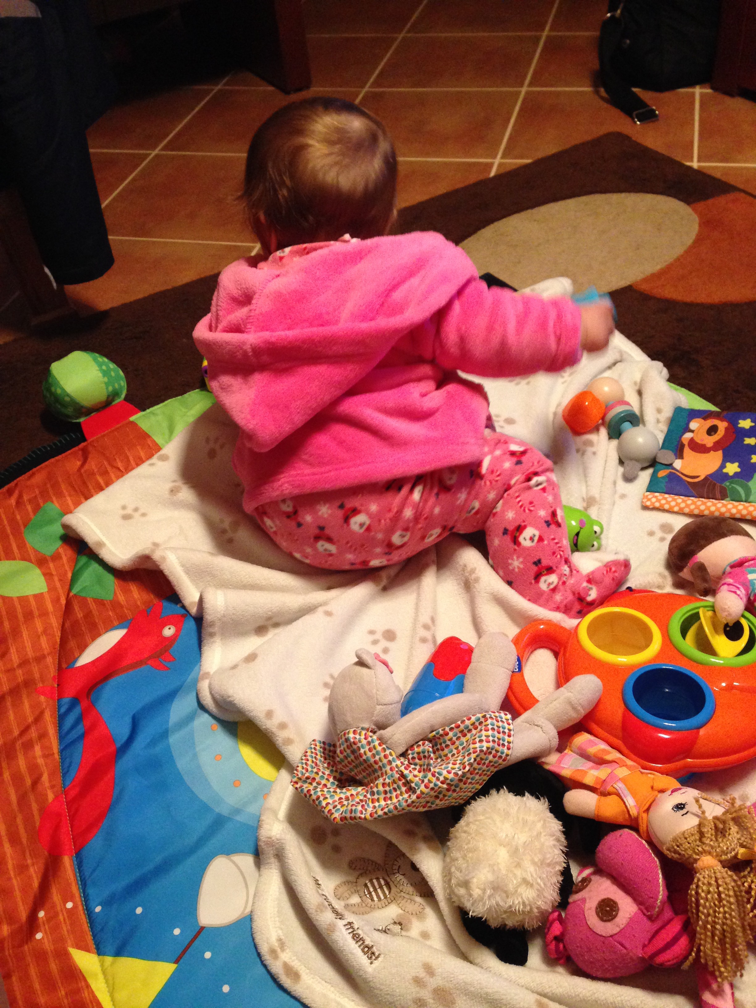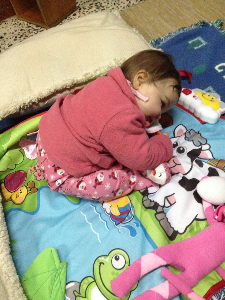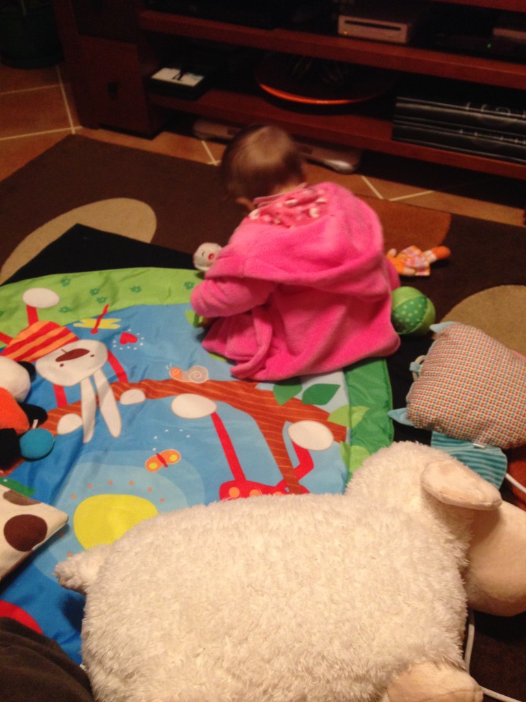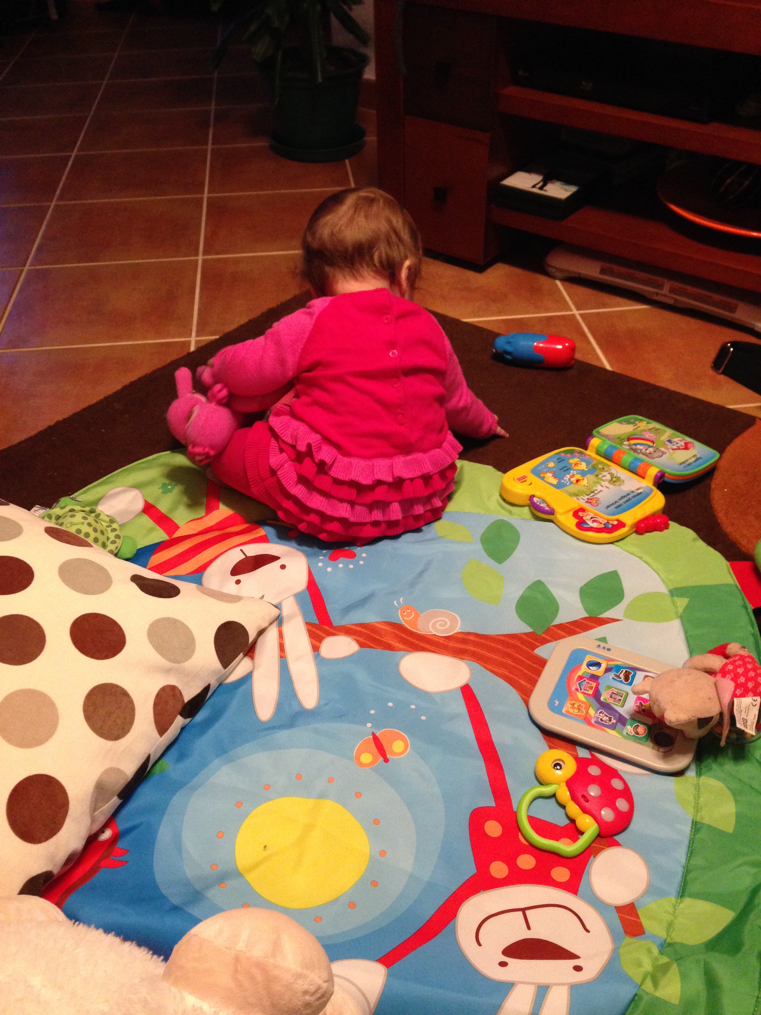 28 Janeiro: Já consegues deslizar quando o terreno é favorável. A mamã sentou-te no sol do tapete (foto abaixo) e daí a pouco já estavas fora do tapete.