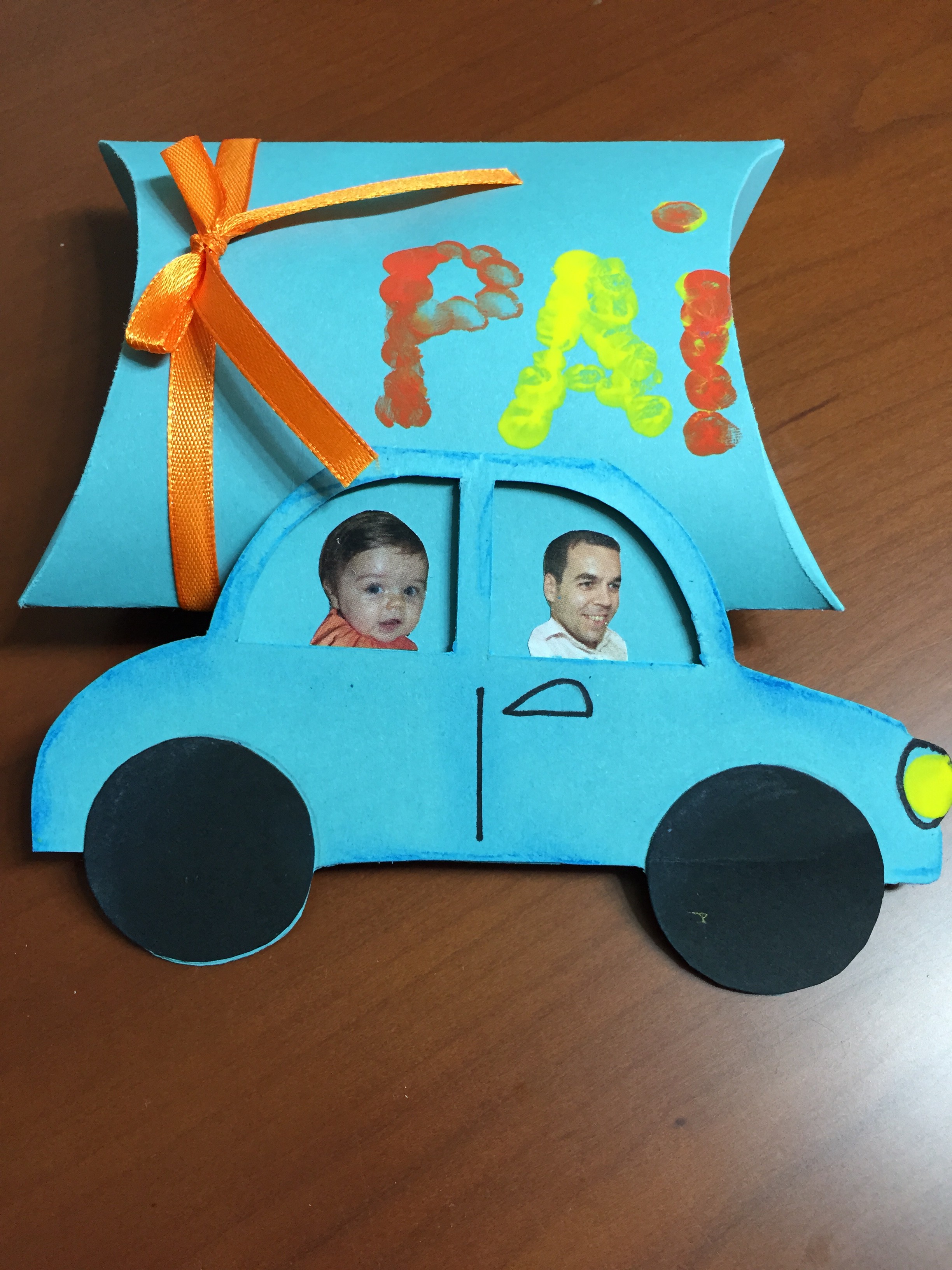 Nas semanas que antecederam este dia, as educadoras na creche foram fazendo umas brincadeiras contigo que resultaram num conjunto de lembranças muito giras para o papá. Recebi um porta-chaves feito à mão, e um calhambeque com uma foto minha a conduzir e tu atrás. Íamos buscar a mamã, com certeza! 🙂 Na creche havia também um desenho feito com a marca do meu pé e do teu. Espero que to dêem no fim do ano escolar.