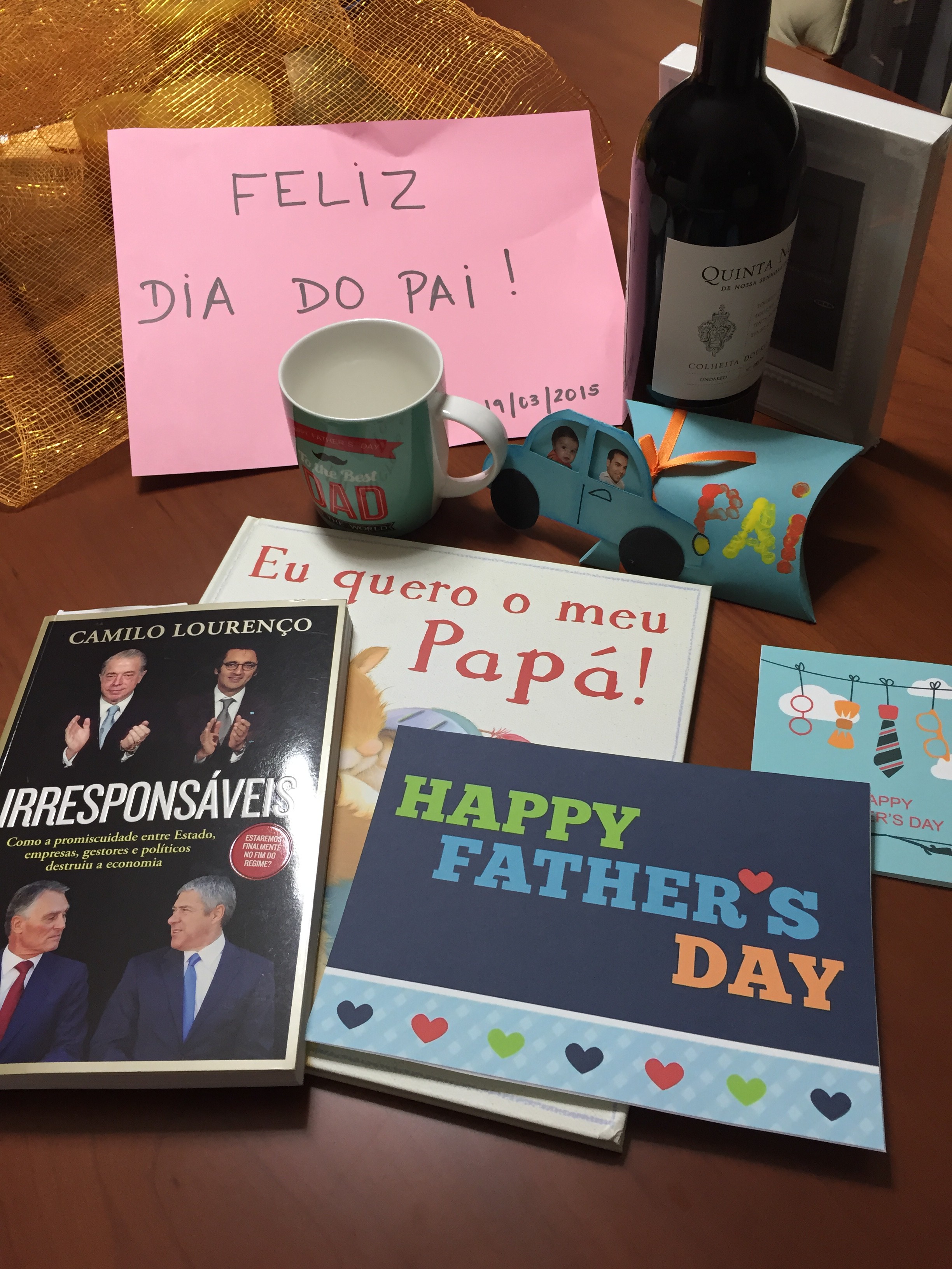 Depois de chegar, ainda deu tempo de me dares mais um miminhos, entre os quais um livro de histórias: “Eu quero o meu Papá!”, uma caneca do dia do Pai, 1 garrafa de vinho, 1 moldura para levar para o work com uma foto tua, um outro livro e 2 postais! 🙂 Andaste atarefada mais a mamã 😀