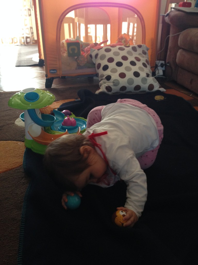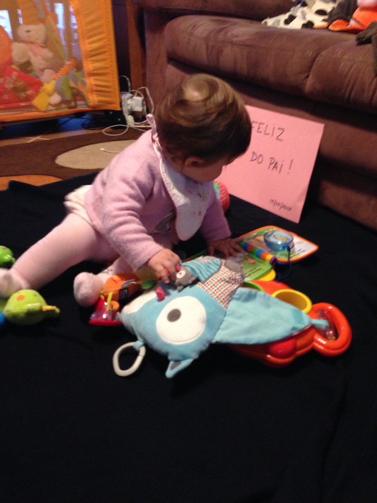 5 de Abril – choraste na visita pascal em casa da avó. Assustaste-te com a água benta que te caiu em cima e tinhas muito sono! Hoje gatinhaste um bocadinho pequenino. Estavas a brincar com o papá e com a mamã na sala. Foi giro!