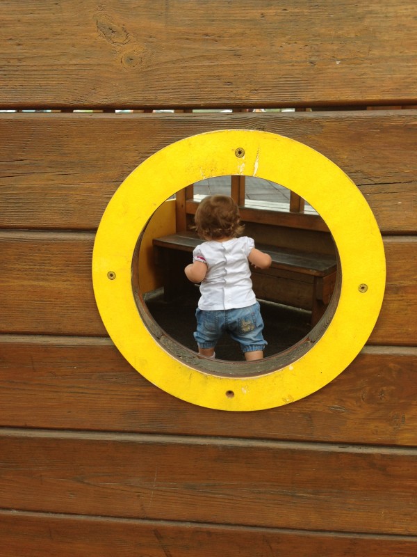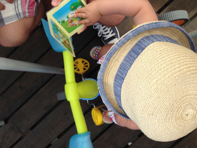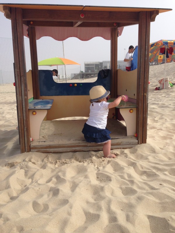 10 de Agosto – hoje subiste os degraus do escorrega da praia sozinha. Mas querem lá ver que já não há parança? Hoje também subiste sozinha para o banquito dentro da casinha.