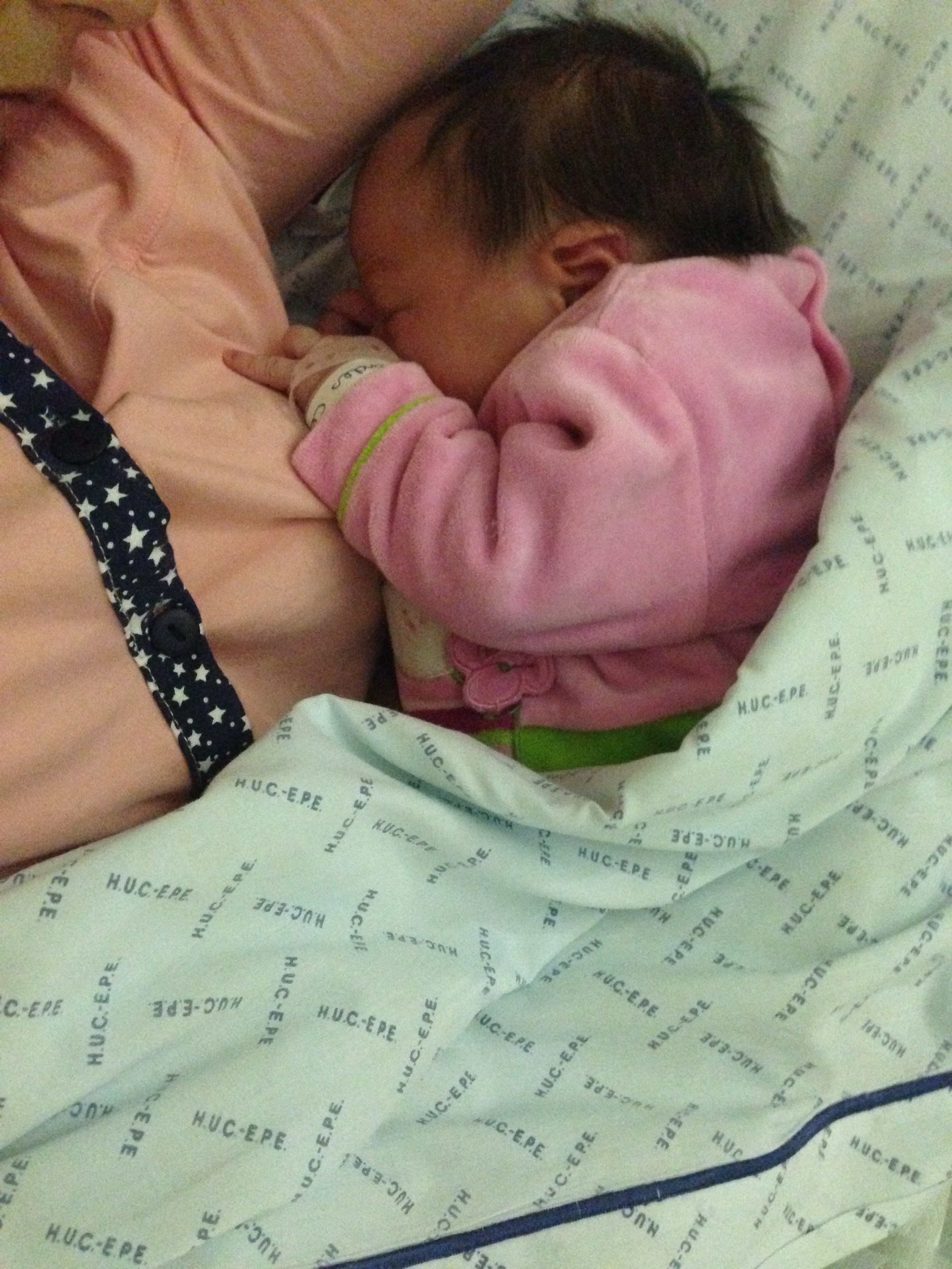 Assim que ma tiraram da barriga vi-lhe um bracinho e a cabeça, depois levaram-na para observar e vestir. Daí a pouco colocaram-na junto à minha cara para nos conhecermos uma à outra e ali estivémos durante um tempo que não consigo contabilizar a estabelecer uma ligação diferente daquela que tínhamos, agora com ela do lado de fora, o nosso primeiro momento a duas.